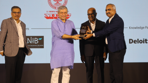 Jaimin Bhatt, Ex-Group Chief Financial Officer & Manish Agrawal, Senior Executive Vice President & Head Bank Finance, Kotak Mahindra Bank receives the award from Shri Ashwini Vaishnaw, Hon’ble Union Minister of Railways, Information and Broadcasting & Electronics and Information Technology and George Varghese, Group CEO of Indian Express Group.